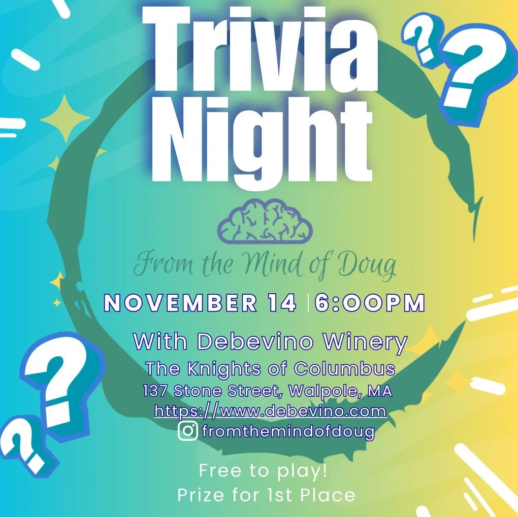 The games will be moderated by local trivia expert Doug Herbst. Prizes will be awarded to the winning teams, and Debevino’s fine selection of handcrafted wines will be available for you to draw inspiration from during the contest.